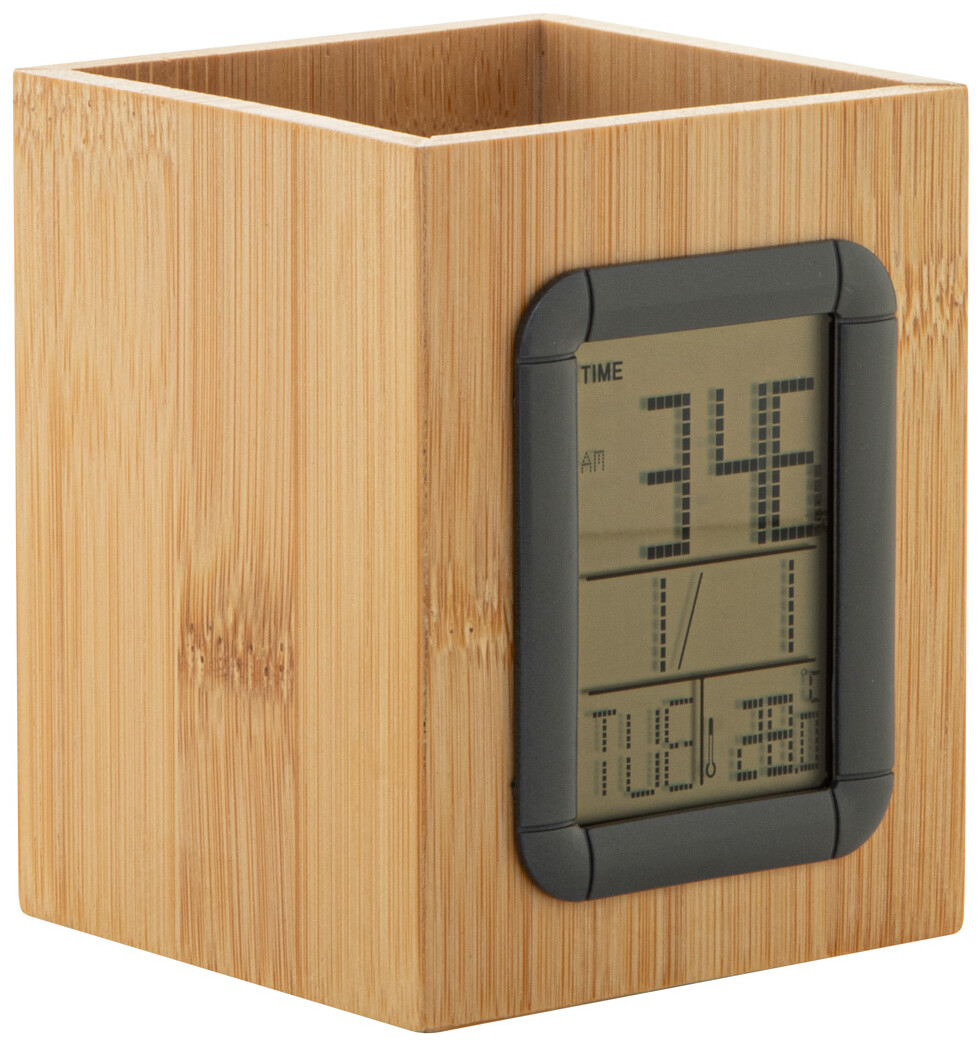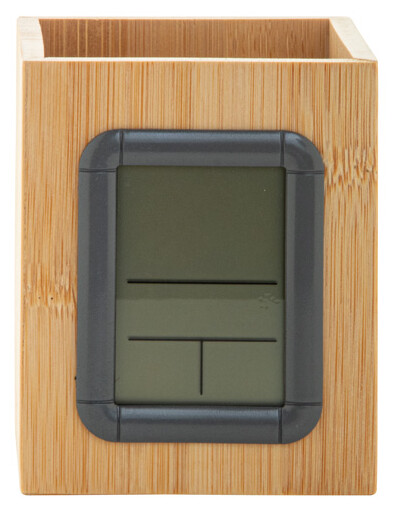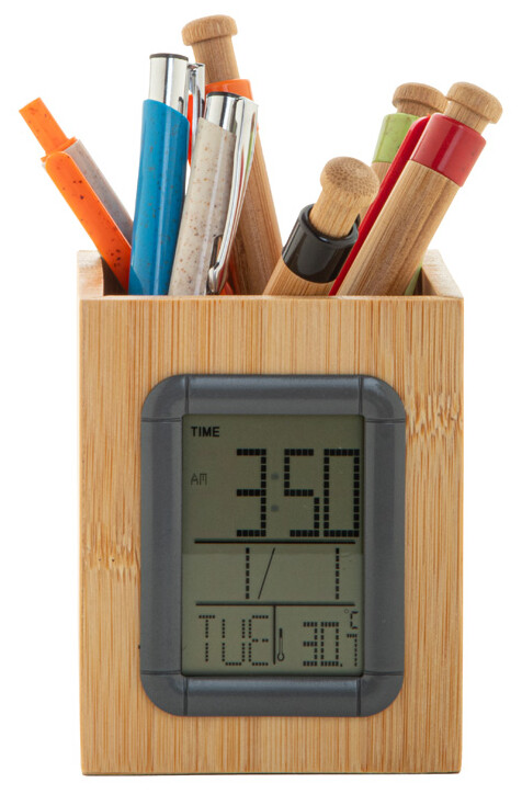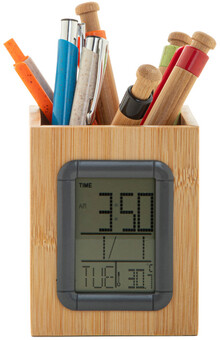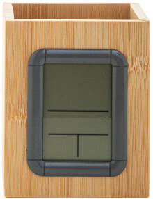 Bambusový stojánek na pera s multifunkčními digitálními hodinami. Funkce: budík, kalendář a teploměr. S knoflíkovou baterií.