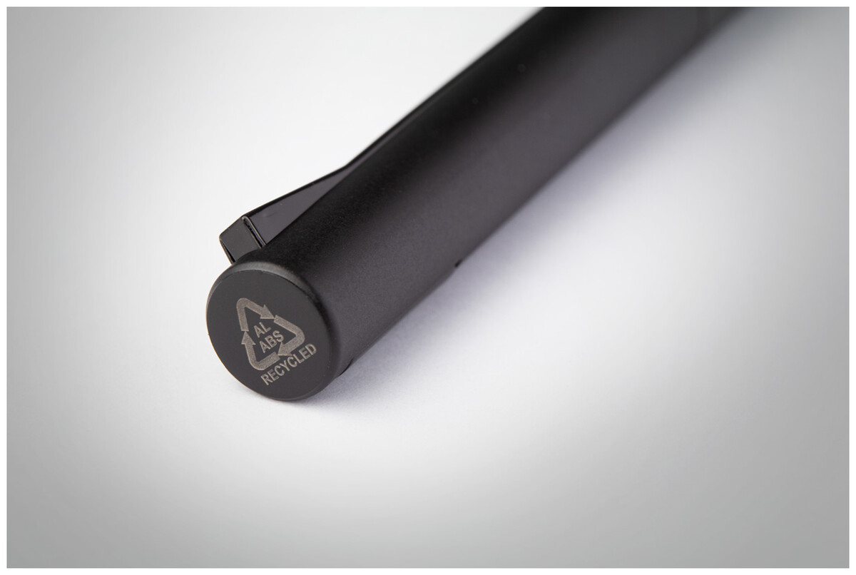 Kuličkové pero z recyklovaného hliníku v matné metalické barvě s horní částí z recyklovaného ABS a speciálním klipem. S modrou náplní.