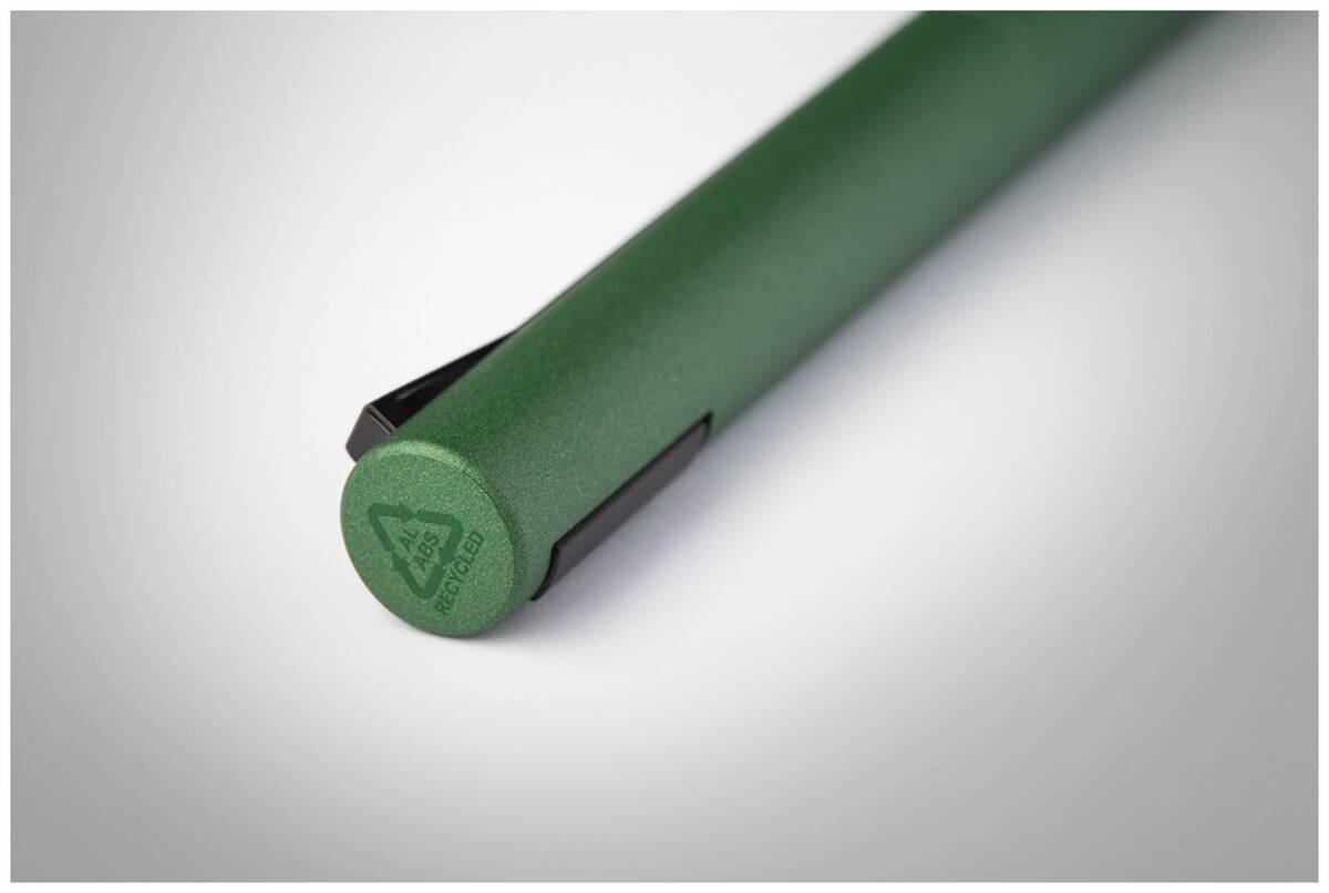 Kuličkové pero z recyklovaného hliníku v matné metalické barvě s horní částí z recyklovaného ABS a speciálním klipem. S modrou náplní.