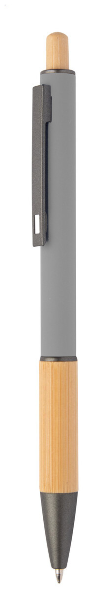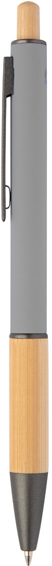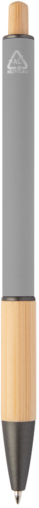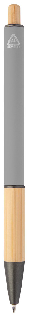 Kuličkové pero z recyklovaného hliníku s bambusovým úchopem a tlačítkem, pogumovaným tělem a kovovými částmi. S modrou náplní.
