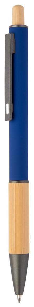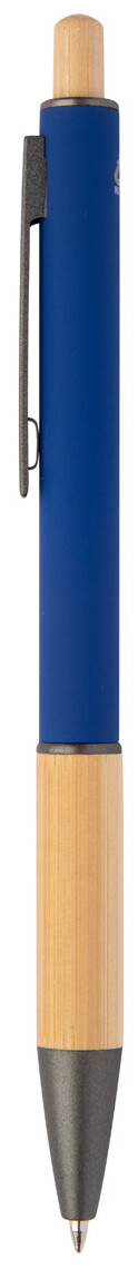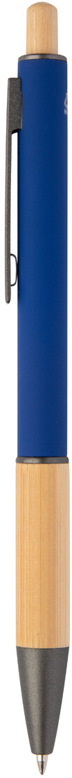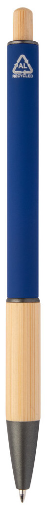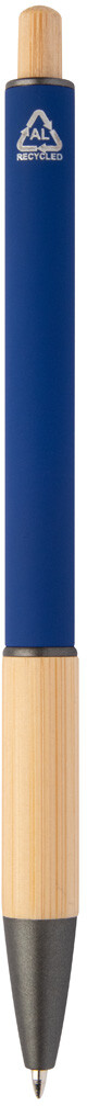 Kuličkové pero z recyklovaného hliníku s bambusovým úchopem a tlačítkem, pogumovaným tělem a kovovými částmi. S modrou náplní.