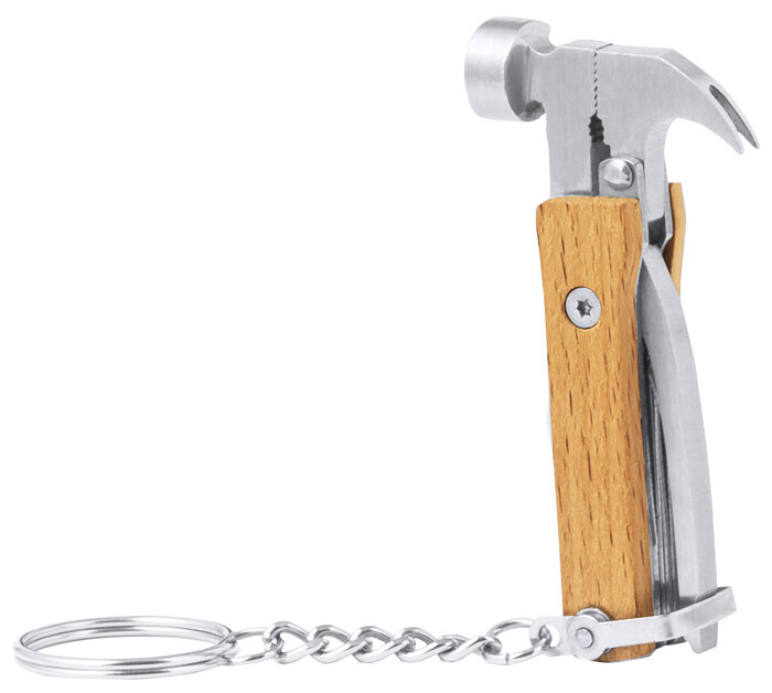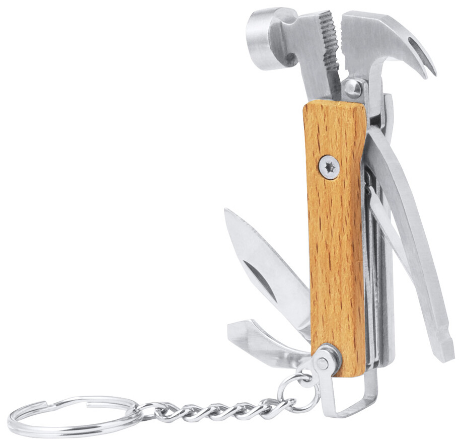 Multifunkční nářadí z nerezové oceli s dřevěnou rukojetí a 7 funkcemi. S kovovým kroužkem na klíče.
