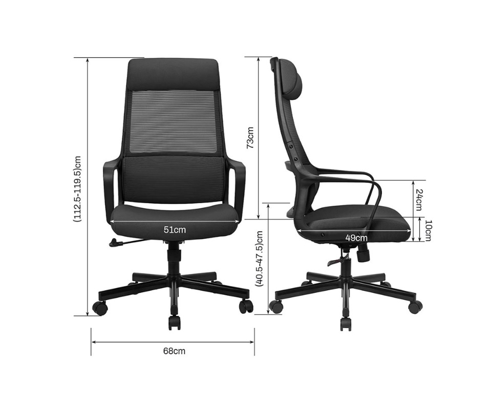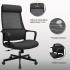 Kancelářská židle s vysokým prodyšným opěrákem, opěrkou hlavy, houpací mechanismus s nastavením síly protiváhy, bederní opěrka a ocelová lakovaná báze.