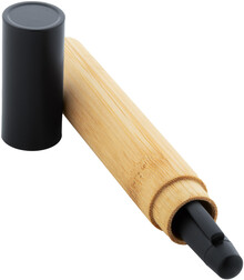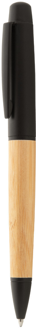 Elegantní černé kovové kuličkové pero s bambusovým tělem a černými částmi. V pouzdře z bambusové tuby s černým uzávěrem. S modrou náplní.