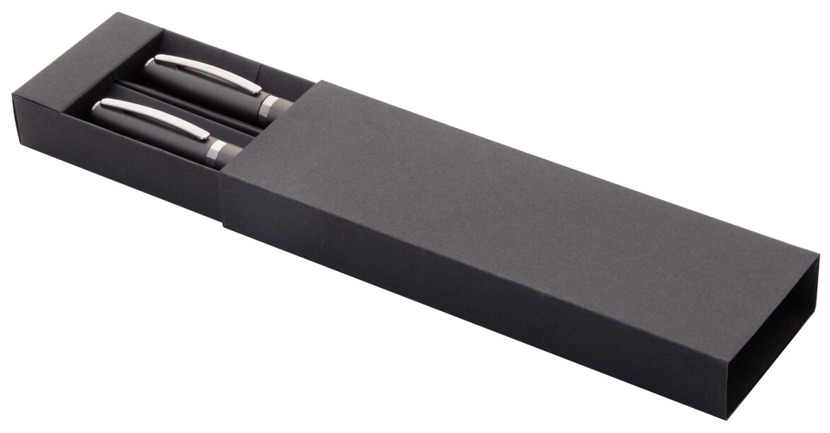 Sada per z recyklovaného hliníku s rollerem a kuličkovým perem v černé papírové dárkové krabičce. S modrou náplní.