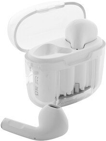 Sluchátka z recyklovaného ABS plastu s funkcí hands-free volání, v průhledném nabíjecím pouzdře. Včetně nabíjecího kabelu USB.