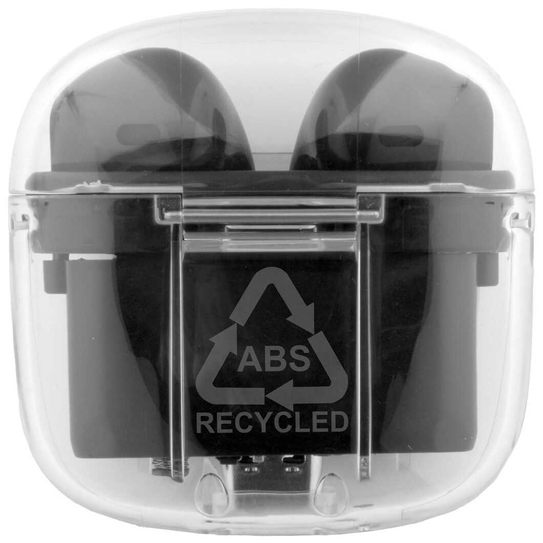 Sluchátka z recyklovaného ABS plastu s funkcí hands-free volání, v průhledném nabíjecím pouzdře. Včetně nabíjecího kabelu USB.