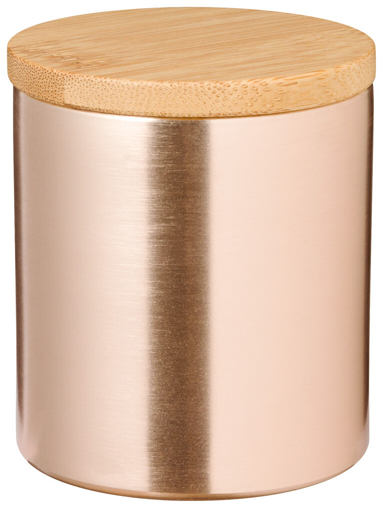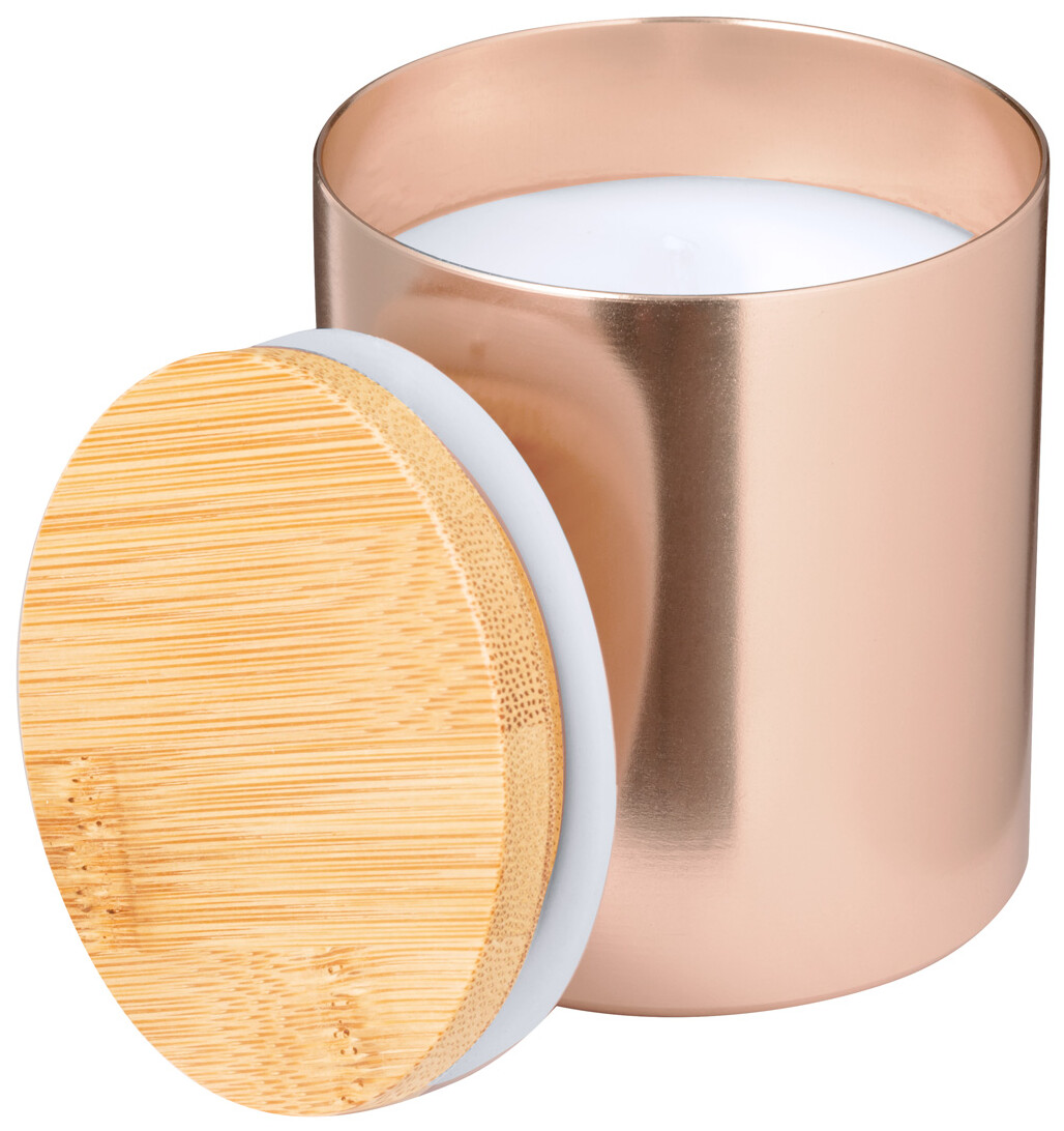 Vanilková vonná svíčka v hliníkovém držáku s bambusovým víčkem.