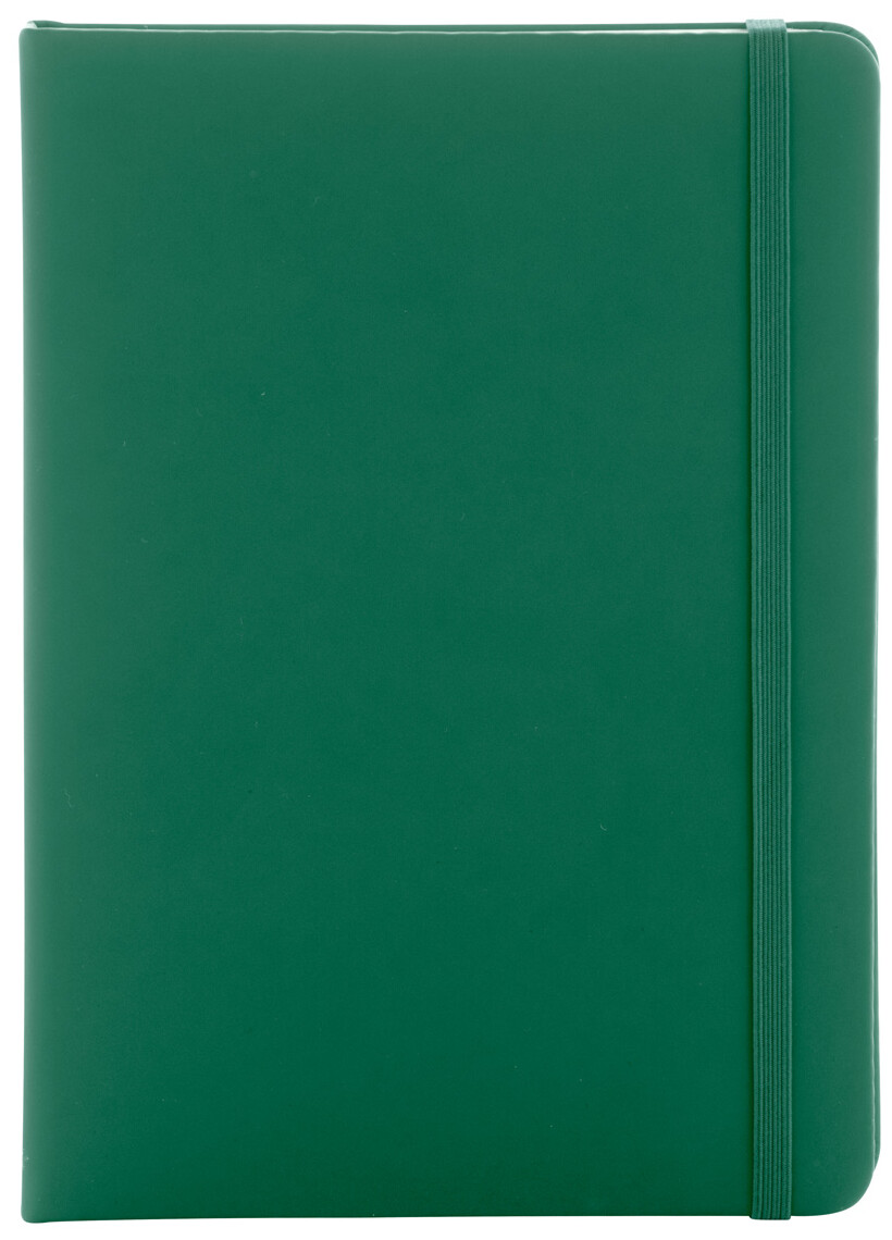 Blok A5 z recyklované PU kůže se 100 čistými listy z recyklovaného papíru. Se záložkou v odpovídající barvě a gumičkou.