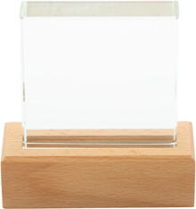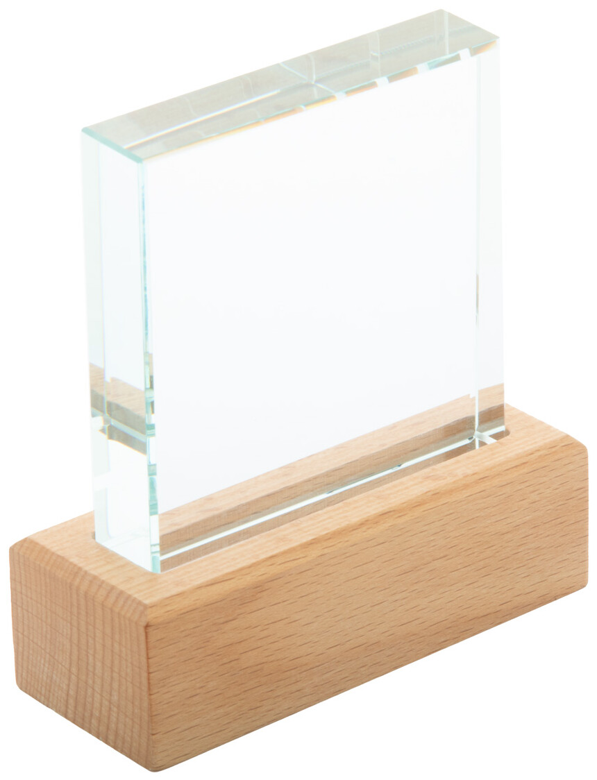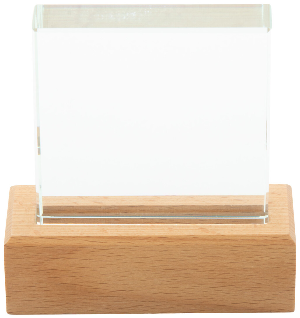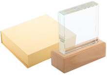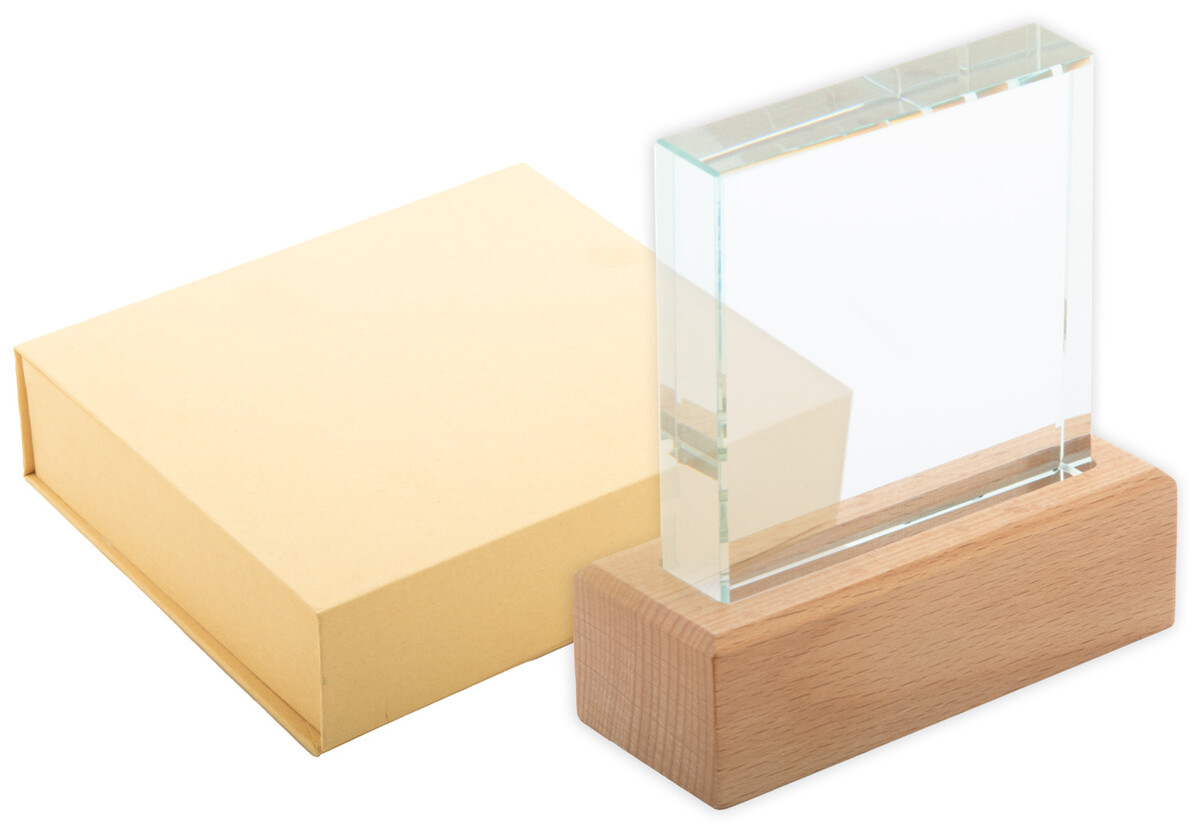 Skleněná trofej s podnoží z bukového dřeva. V kraftové dárkové krabičce.
