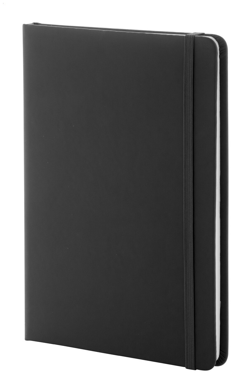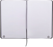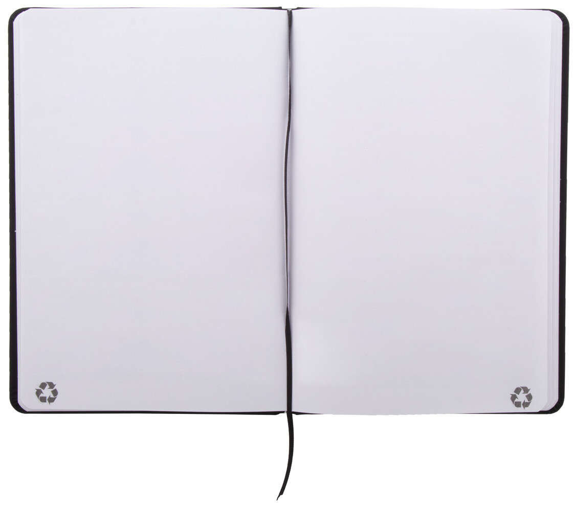 Blok A5 z recyklované PU kůže se 100 čistými listy z recyklovaného papíru. Se záložkou v odpovídající barvě a gumičkou.