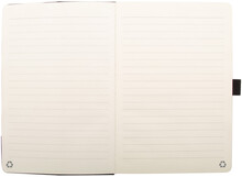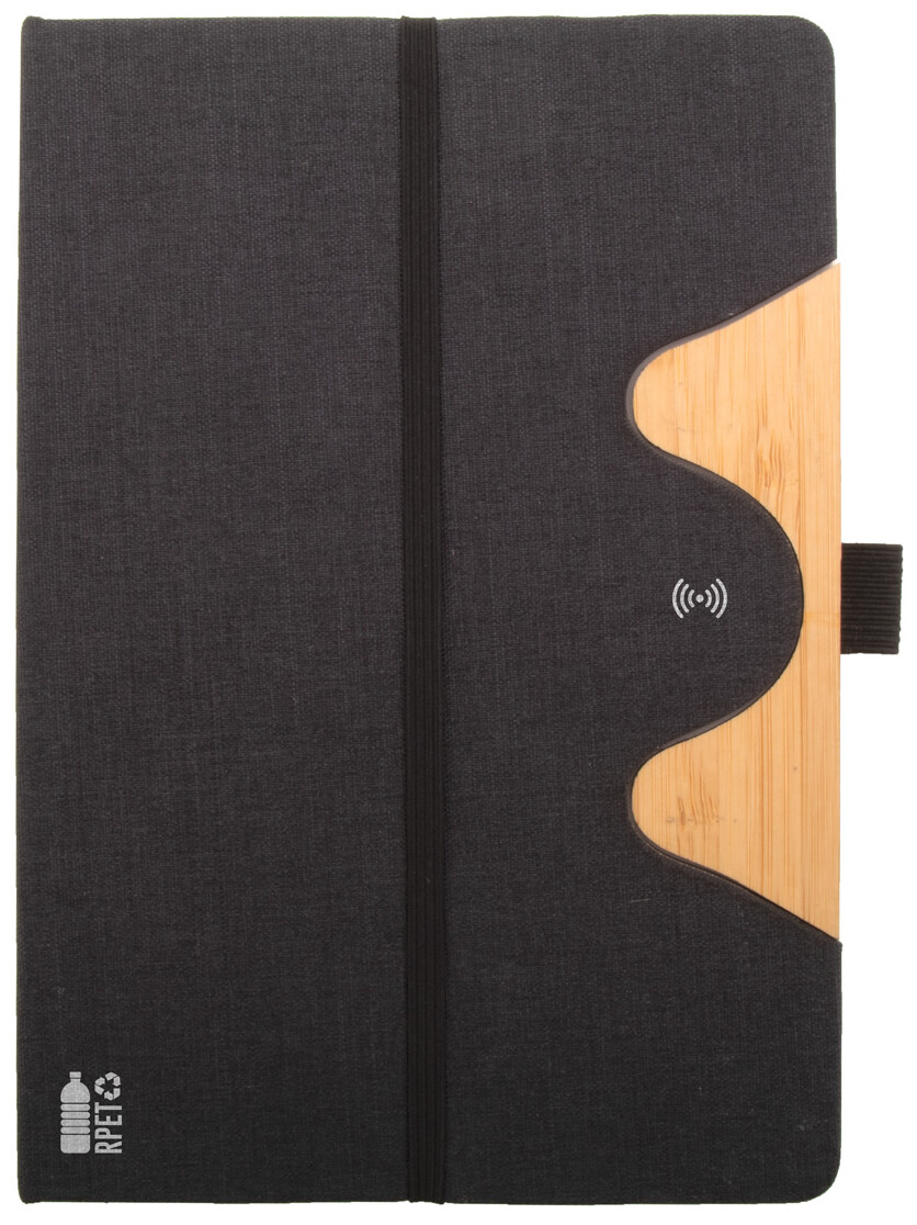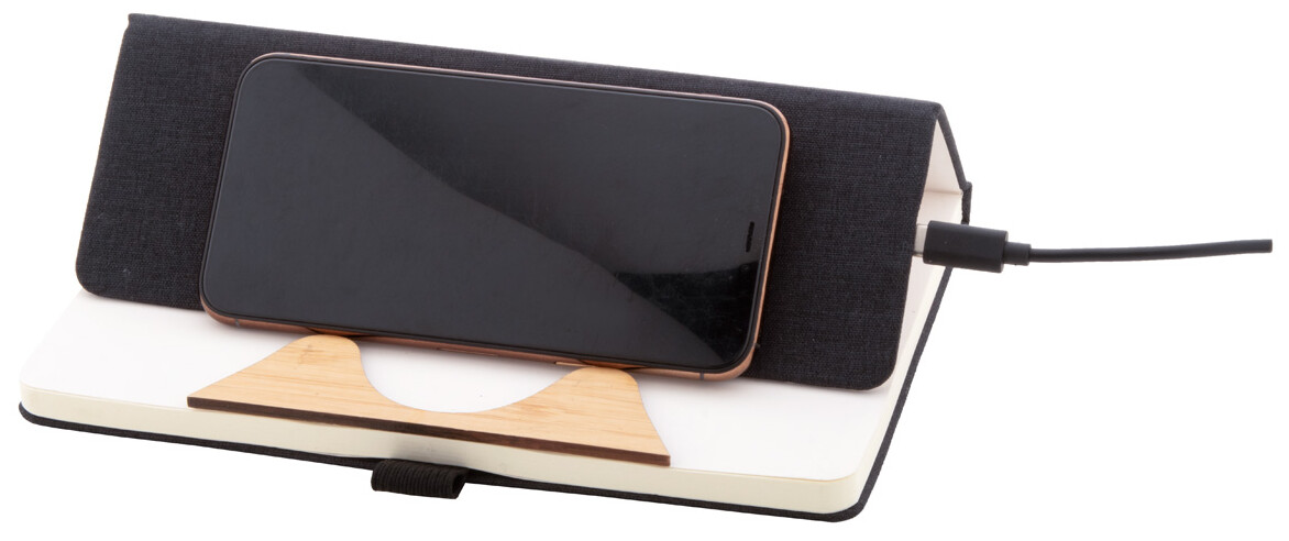 Blok A5 potažený polyesterem RPET s bambusovou vložkou, funkcí stojánku na mobil a vestavěnou bezdrátovou rychlonabíječkou (15W). S 80 linkovanými listy z recyklovaného papíru. Včetně USB nabíjecího kabelu.