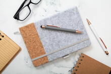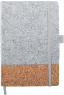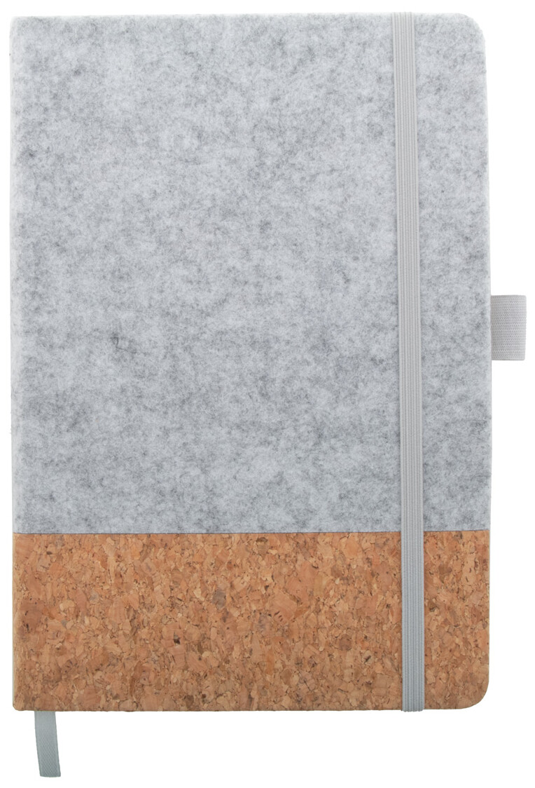 Blok A5 z RPET plsti a přírodního korku s 80 linkovanými listy z recyklovaného papíru. Se záložkou, gumovým páskem a držákem na pero.