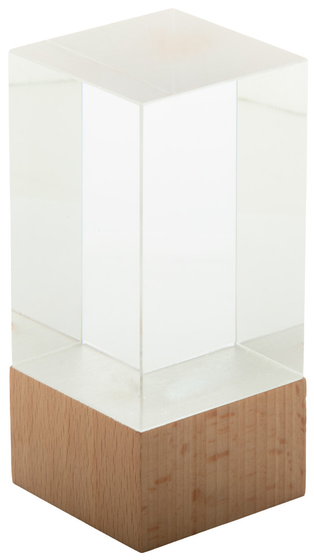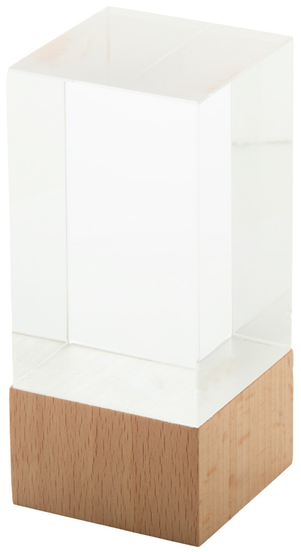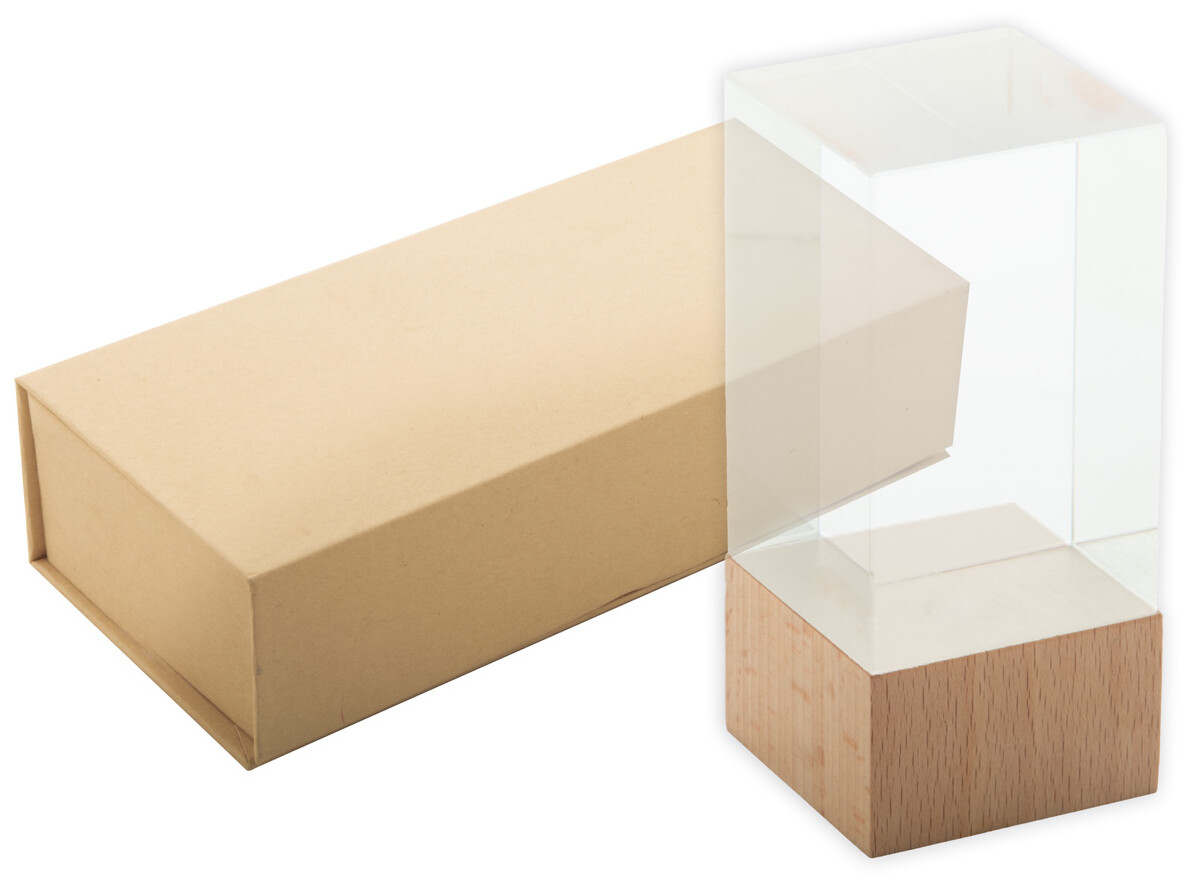 Skleněná trofej s podnoží z bukového dřeva. V kraftové dárkové krabičce.