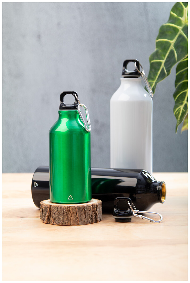 Láhev z recyklovaného hliníku s karabinkou z recyklovaného hliníku, 400 ml.