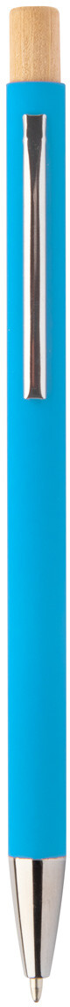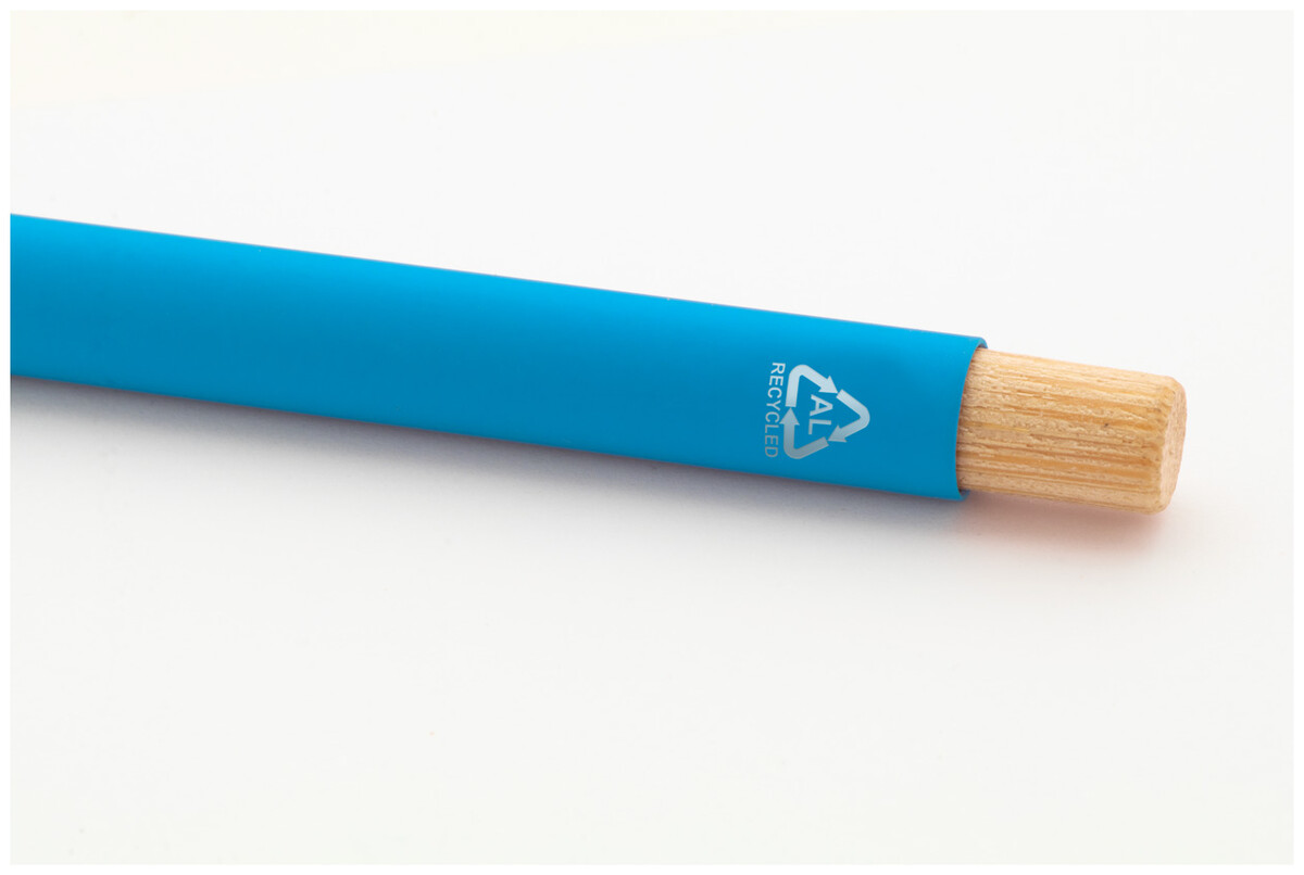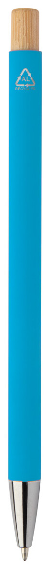Kuličkové pero z recyklovaného hliníku s pogumovaným povrchem a bambusovým tlačítkem a chromovými detaily. Se speciální vrstvou pro zrcadlové laserové gravírování. S modrou náplní.