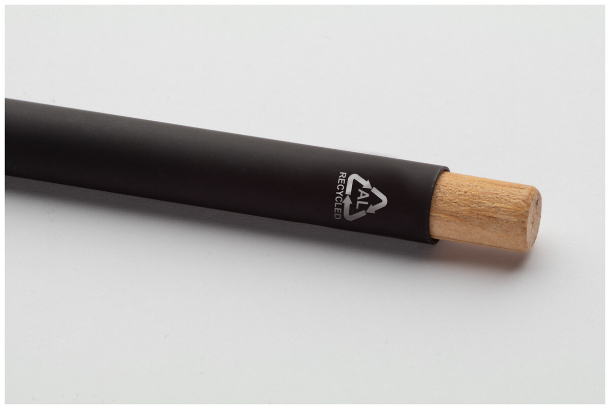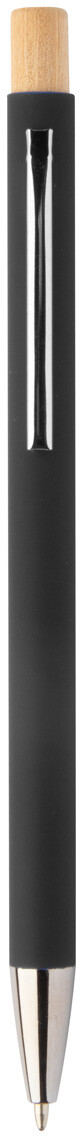 Kuličkové pero z recyklovaného hliníku s pogumovaným povrchem a bambusovým tlačítkem a chromovými detaily. Se speciální vrstvou pro zrcadlové laserové gravírování. S modrou náplní.