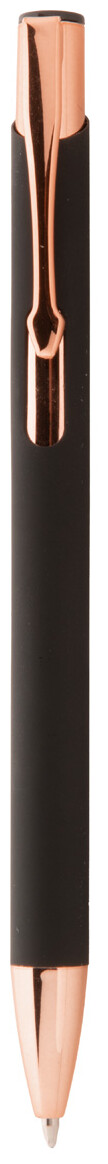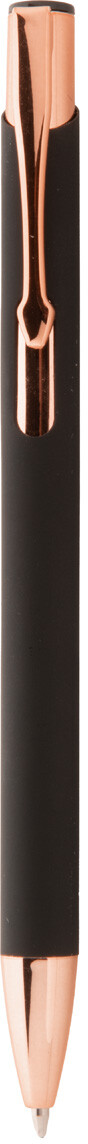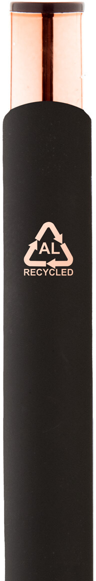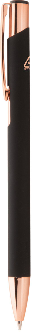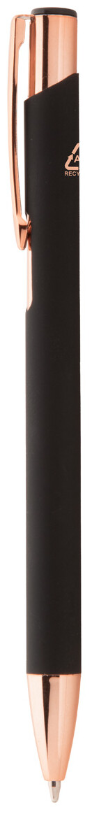 Kuličkové pero z recyklovaného hliníku s pogumovaným povrchem a detaily v barvě růžového zlata. Se speciální povrchovou úpravou pro zrcadlové laserové gravírování v barvě růžového zlata. S modrou náplní.