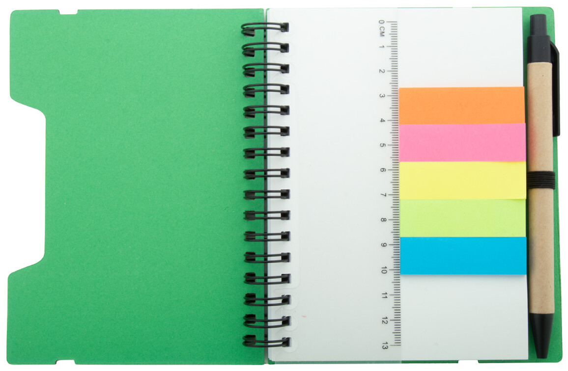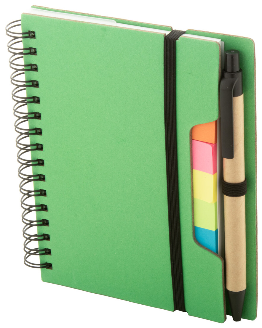 Spirálový blok A6 z recyklovaného papíru se 70 linkovanými listy a 125 popisovači stránek (v 5 různých barvách). S gumovým páskem a držákem na pero. Včetně kuličkového pera z recyklovaného papíru s modrou náplní.