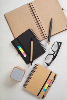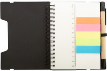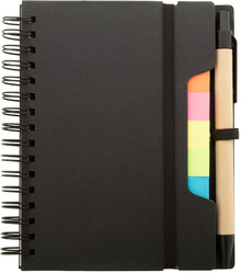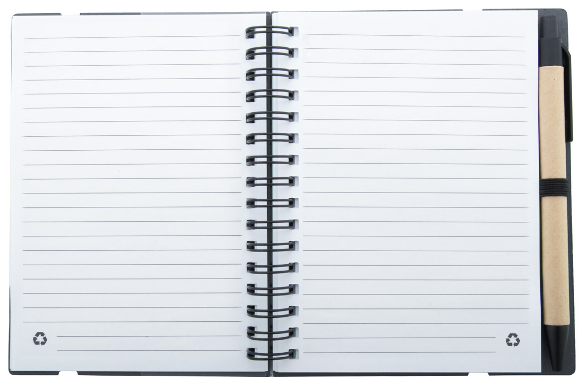 Spirálový blok A6 z recyklovaného papíru se 70 linkovanými listy a 125 popisovači stránek (v 5 různých barvách). S gumovým páskem a držákem na pero. Včetně kuličkového pera z recyklovaného papíru s modrou náplní.