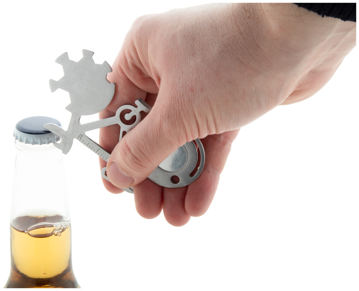 Multifunkční nářadí ve tvaru kola z nerezové oceli s 11 funkcemi.