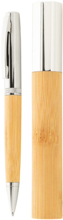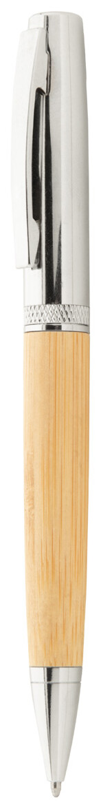Elegantní kovové kuličkové pero s bambusovým tělem a lesklými chromovanými částmi. V bambusovém pouzdře s chromovým uzávěrem. S modrou náplní.