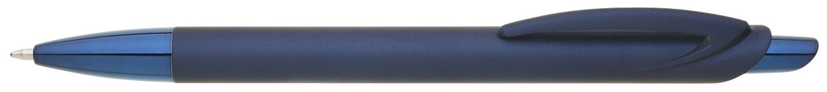 Modré plastové metalické tělo doplňují lesklé barevné doplňky. Velkoobsahová gelová náplň, modře píšící.