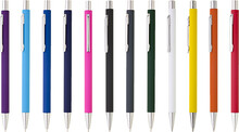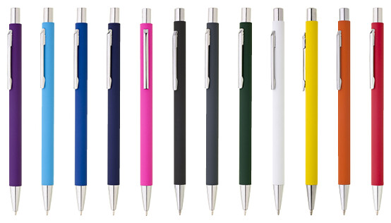 Tenká, jednoduchá propiska s černým pogumovaným tělem a chromovými doplňky. Náplň X20, modře píšící.