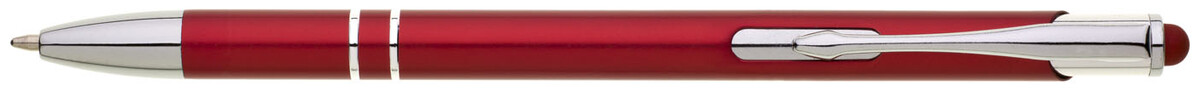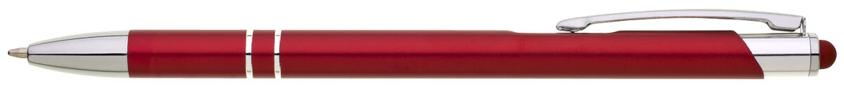Tenká červená hliníková propiska s chromovými doplňky a touchem v barvě těla. Náplň X20 modře píšící.