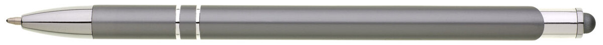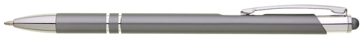 Tenká šedá hliníková propiska s chromovými doplňky a touchem v barvě těla. Náplň X20 modře píšící.