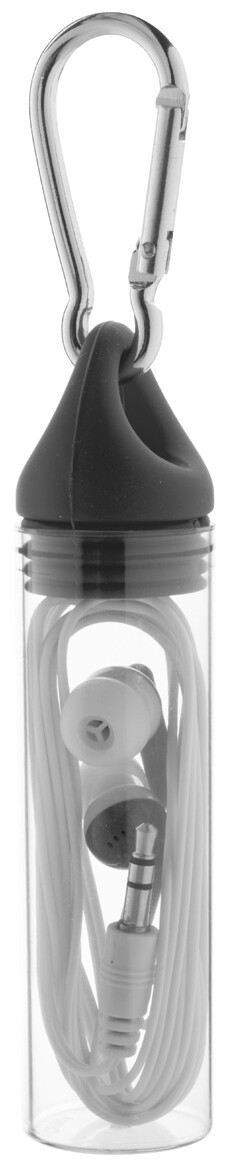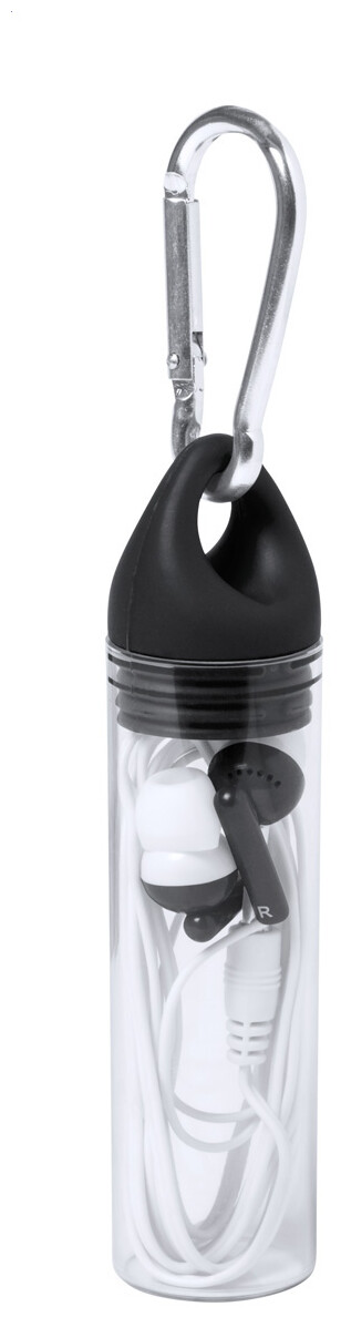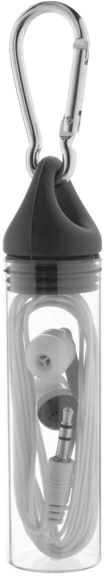 Sluchátka do uší s 3,5 mm audio Jackem, v plastové krabičce s karabinkou a stejně barevným vrškem.