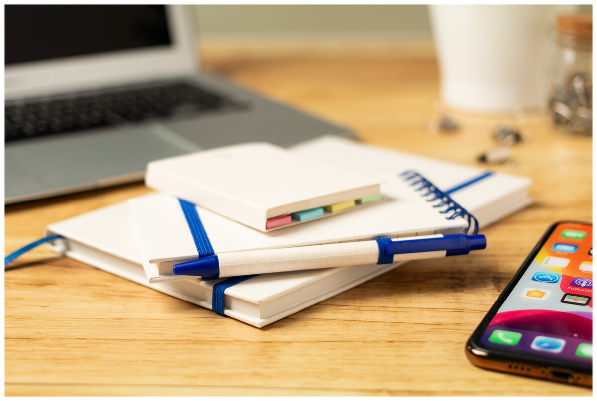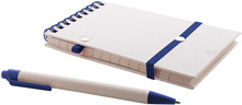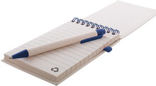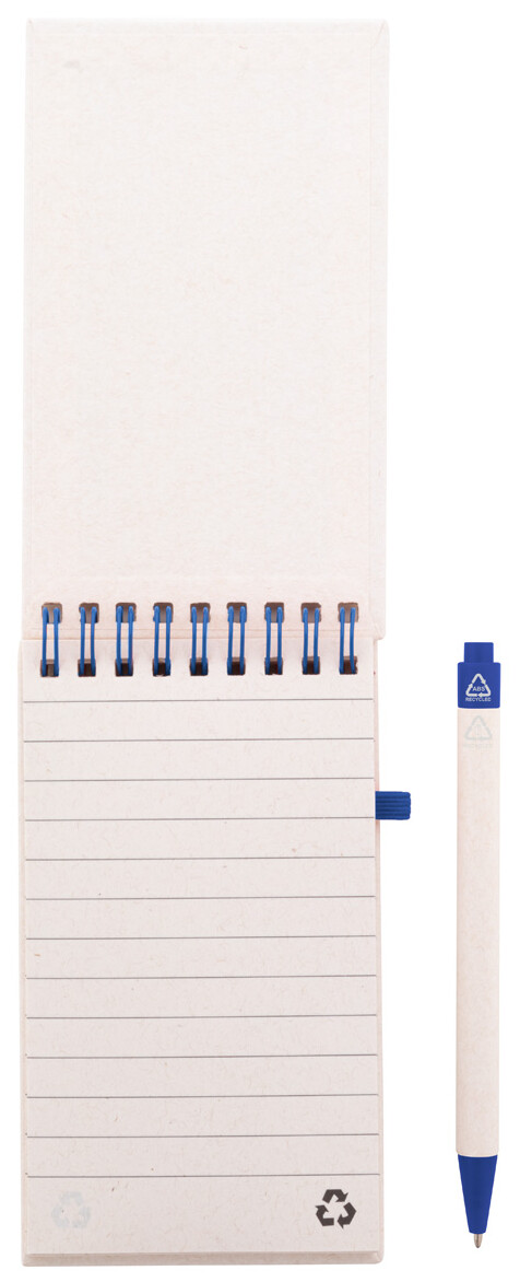 Spirálový blok A6 s deskami z recyklovaného z kartonu na mléko s pevnou vazbou a 70 linkovanými listy. Se spirálovými kroužky ve stejné barvě, gumičkou a poutkem na pero. Včetně recyklovaného kartonového papíru na mléko a recyklovaného ABS plastového kuličkového pera s modrou náplní.