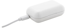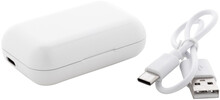 Sluchátka z recyklovaného ABS plastu s funkcí handsfree, v plastovém nabíjecím pouzdře s baterií 400 mAh. Včetně nabíjecího kabelu USB.