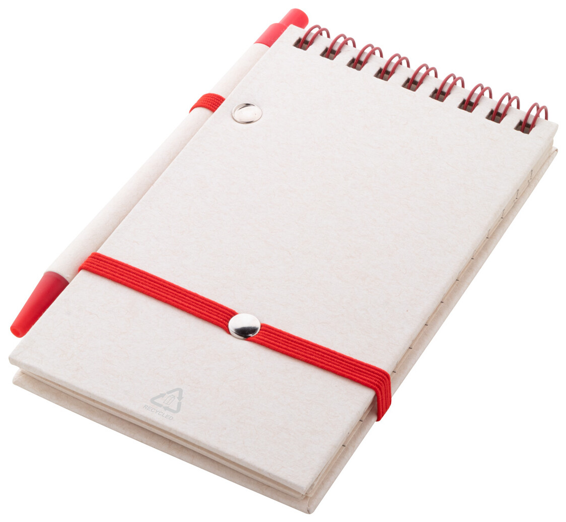 Spirálový blok A6 s deskami z recyklovaného z kartonu na mléko s pevnou vazbou a 70 linkovanými listy. Se spirálovými kroužky ve stejné barvě, gumičkou a poutkem na pero. Včetně recyklovaného kartonového papíru na mléko a recyklovaného ABS plastového kuličkového pera s modrou náplní.