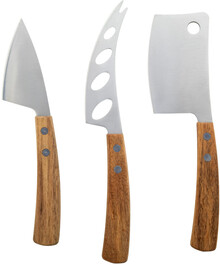 3dílná sada nožů na sýr z nerezové oceli s rukojetí z akáciového dřeva. V krabičce ve tvaru knihy z kraftového papíru.