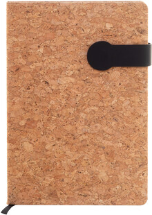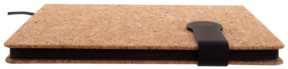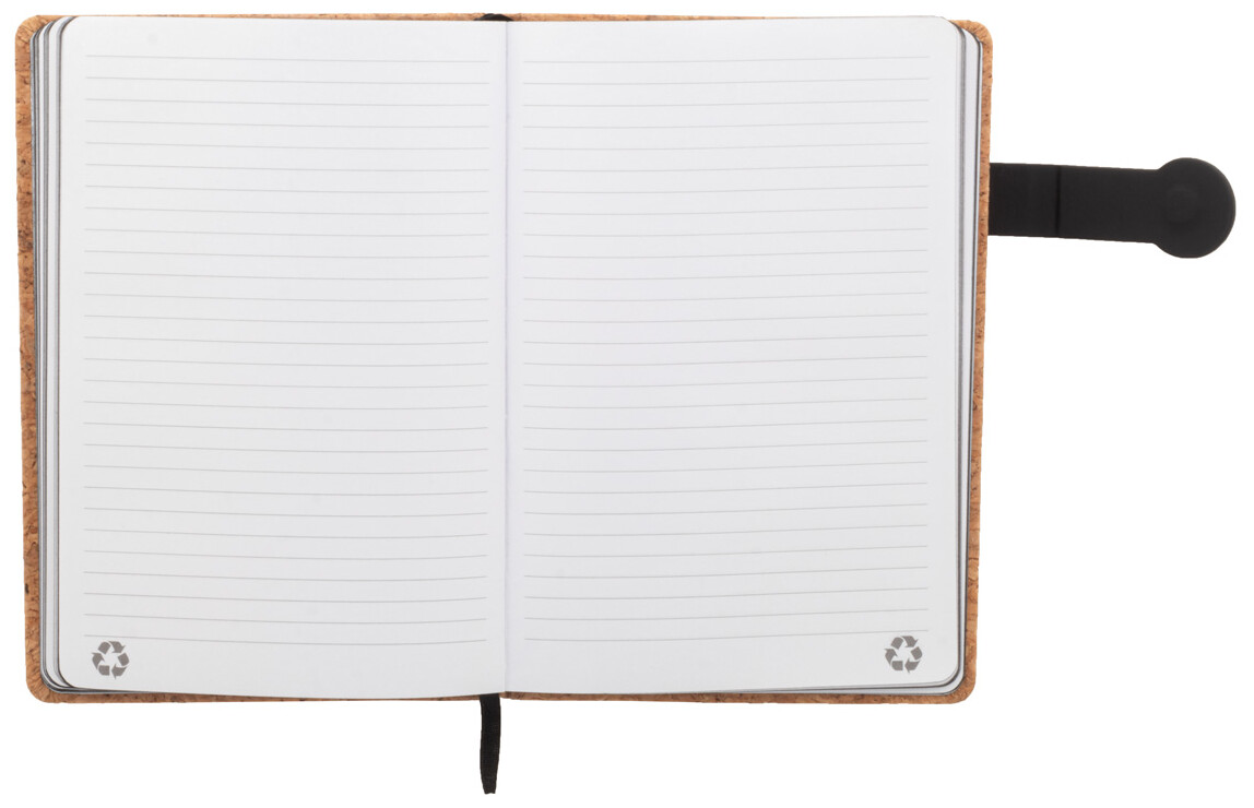 Blok A5 potažený přírodním korkem a recyklovanou PU kůží s magnetickým zavíráním, záložkou a 80 linkovanými listy z recyklovaného papíru s barevnými stranami.