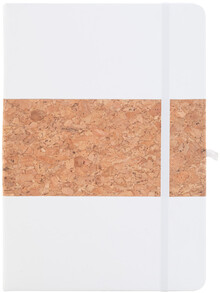 Blok A5 potažený přírodním korkem a recyklovanou PU kůží se záložkou v odpovídající barvě, gumičkou a držákem na pero. S 80 linkovanými listy z recyklovaného papíru.
