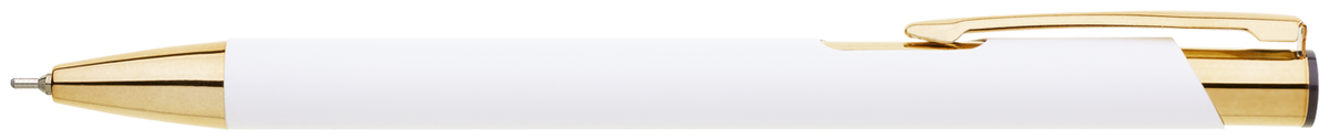 Kovová propiska s pogumovaným povrchem a zlatými doplňky, s efektem laseru v lesklé zlaté barvě. Náplň velkoobsahová semigelová.