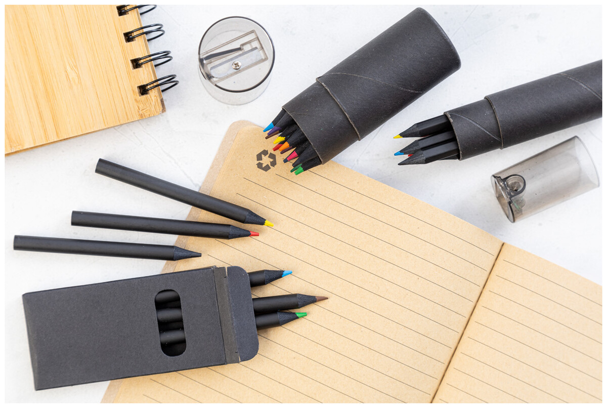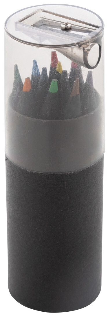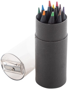 12dílná sada pastelek z černého dřeva v kulatém černém pouzdře z kartonu s plastovým ořezávátkem.
