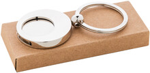 Kulatý kovový přívěsek na klíče se žetonem do nákupního vozíku. V kraftové papírové krabičce.
