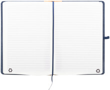 Blok A5 potažený polyesterem RPET s hřbetem z přírodního korku a 80 linkovanými listy z recyklovaného papíru. Se záložkou, gumovým páskem a držákem na pero.