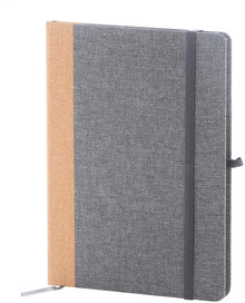 Blok A5 potažený polyesterem RPET s hřbetem z přírodního korku a 80 linkovanými listy z recyklovaného papíru. Se záložkou, gumovým páskem a držákem na pero.