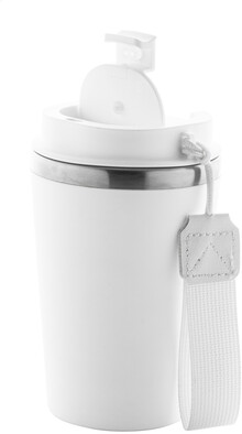 Dvoustěnný termo hrnek z recyklované nerezové oceli s vnějším PP plastem a víčkem na pití. S popruhem na přenášení RPET. 350 ml.