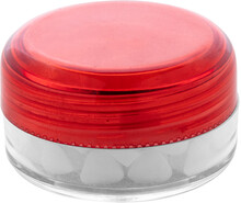 Kulatá průhledná plastová dóza s mintovými bonbóny s barevným šroubovacím víčkem. Obsahující cca. 12 gramů mentolových bonbonů bez cukru.