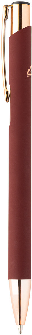 Kuličkové pero z recyklovaného hliníku s pogumovaným povrchem a detaily v barvě růžového zlata. Se speciální povrchovou úpravou pro zrcadlové laserové gravírování v barvě růžového zlata. S modrou náplní.