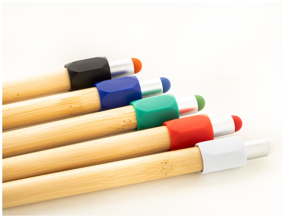 Bambusové kuličkové a dotykové pero s fidget spinnerem z recyklovaného ABS plastu. S modrou náplní.