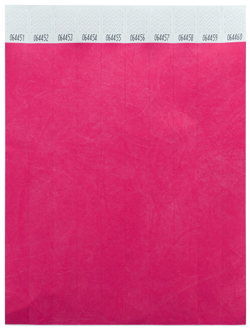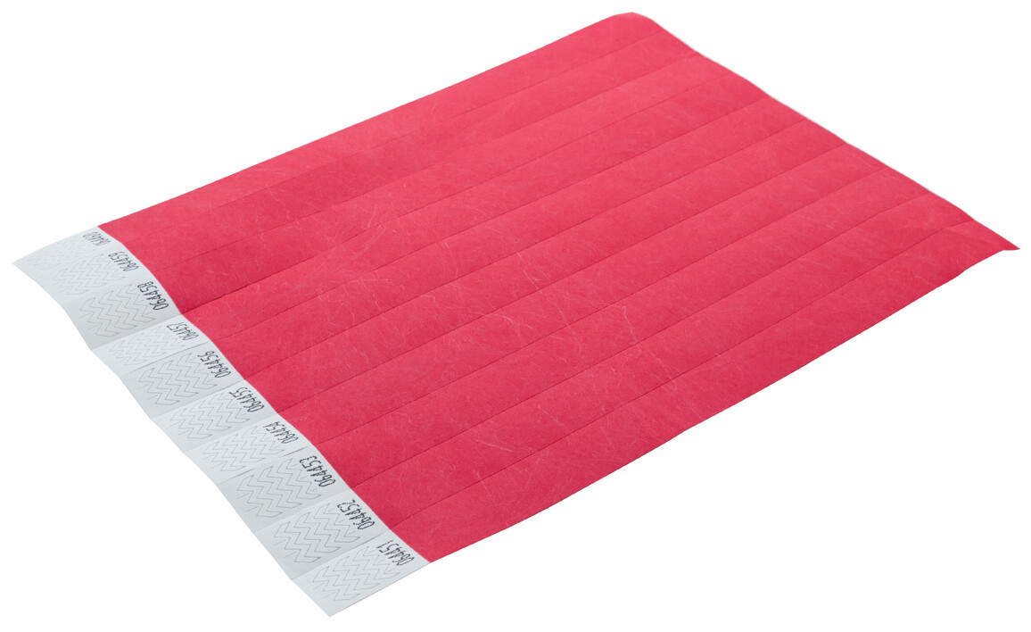 Jeden arch 19 mm širokých tyvekových náramků (10 ks) s lepicím bezpečnostním uzávěrem a jedinečným číslováním.