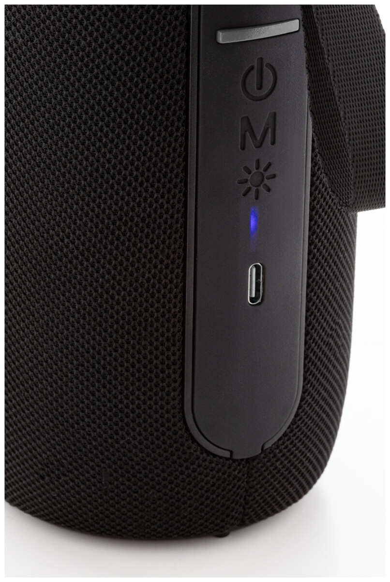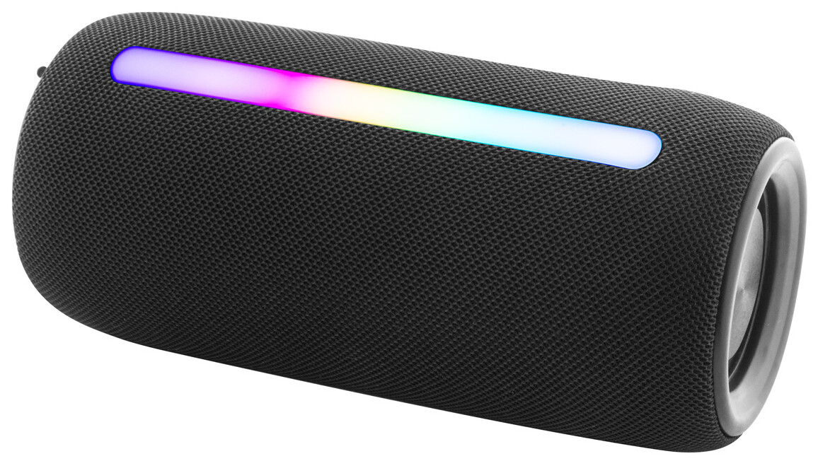 Bezdrátový reproduktor potažený polyesterovou tkaninou s vícebarevným LED světlem a popruhem na přenášení. Se 2 reproduktory, funkcí hands-free volání a vestavěnou dobíjecí baterií (1200 mAh). Včetně nabíjecího kabelu USB.