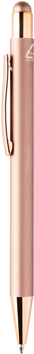 Recyklované hliníkové kuličkové a dotykové pero s pogumovaným tělem a barevnými lesklými kovovými částmi. Se speciální vrstvou pro zrcadlové gravírování odpovídající kovovým částem. S modrou náplní.