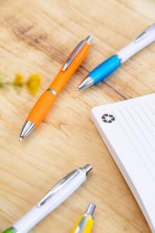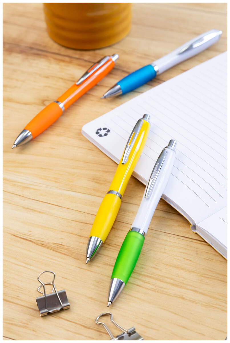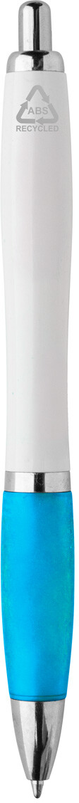 Kuličkové pero z recyklovaného ABS plastu s bílým tělem, barevným úchopem a chromovanými částmi. S modrou náplní.
